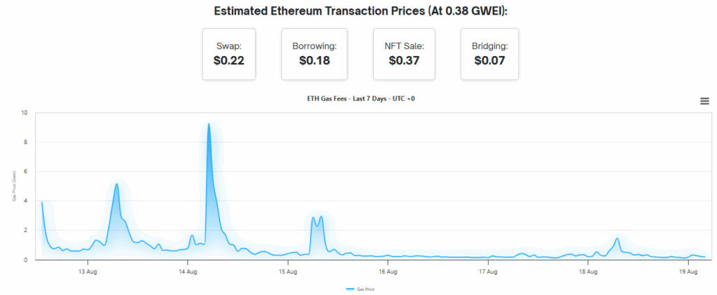 Ethereum’s fees are dynamic and can swing dramatically depending on network congestion. The chart above shows gas fees from the past week, with spikes reaching nearly 9 Gwei, translating into noticeable increases in transaction costs: