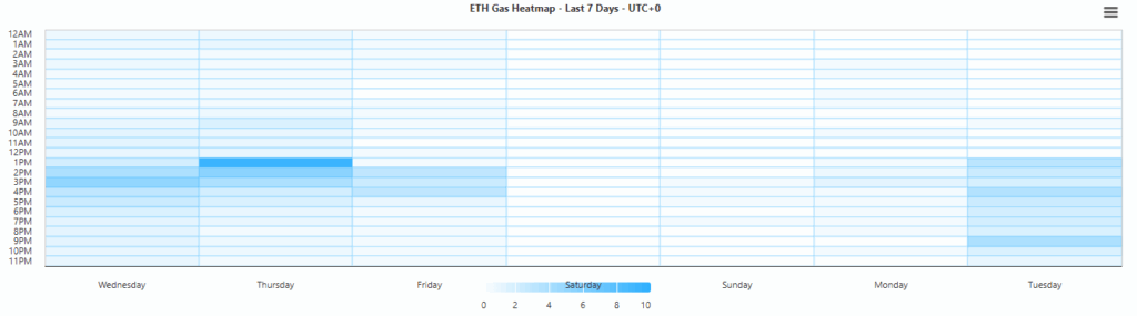 The heatmap above tracks Ethereum gas fees over the past 7 days. Darker blocks show periods when gas prices surged due to heavy network activity. Notice how: