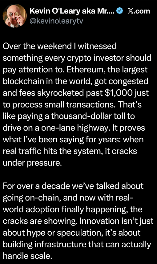 Ethereum likes wearing its crown as the “king of smart contracts”, but it can also charge users like royalty. On average, Ethereum transaction fees can range from $.37 to $1000+. The higher end of that fee spectrum can be seen 20-25% of the time and mostly during major trading events which is when most people are trading and the stress levels are high. During these major rallies or liquidations ETH fees can rocket up to $1000 eating up all your profits and/or cutting deep into your investment (see Kevin O’Leary’s post on X below). ETH transactions take anywhere from 15 seconds to 30 minutes depending on network congestion and gas fees.